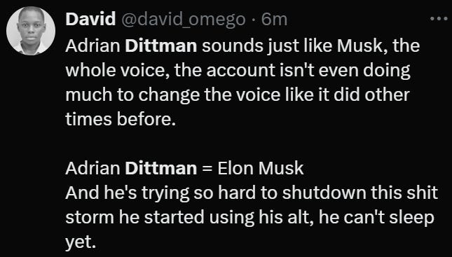 Musk denies being Dittmann, but the timing, tone, and behavior of the account have left everyone with a brain unconvinced.
