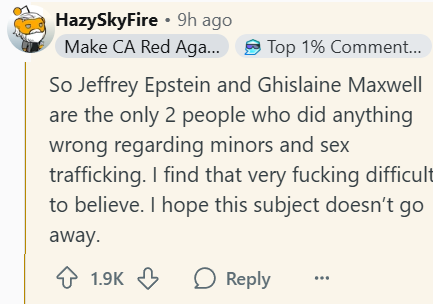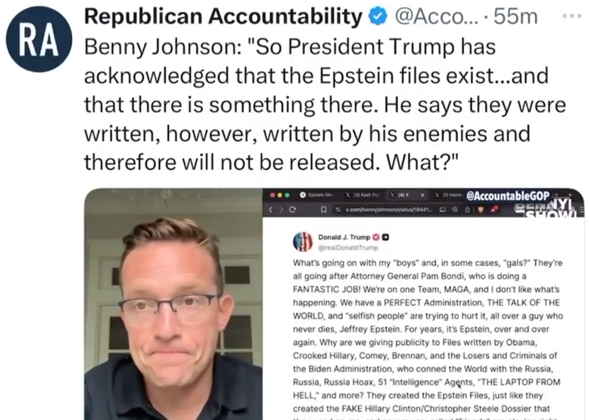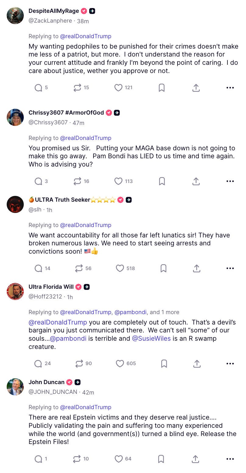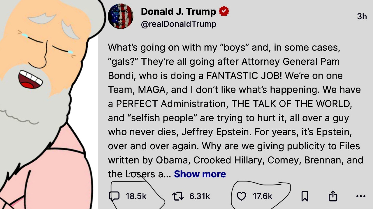 The sad part of this Epstein crap is that Magats are outraged at this fiasco, but really don't seem to care about the attempt to end democracy, the gutting of essential agencies like FEMA and USAID and the slow motion crashing of the economy. This is how you can tell that reality TV is what REALLY rules their lives. Thank you, God! Amen! Awomen! Ramen!