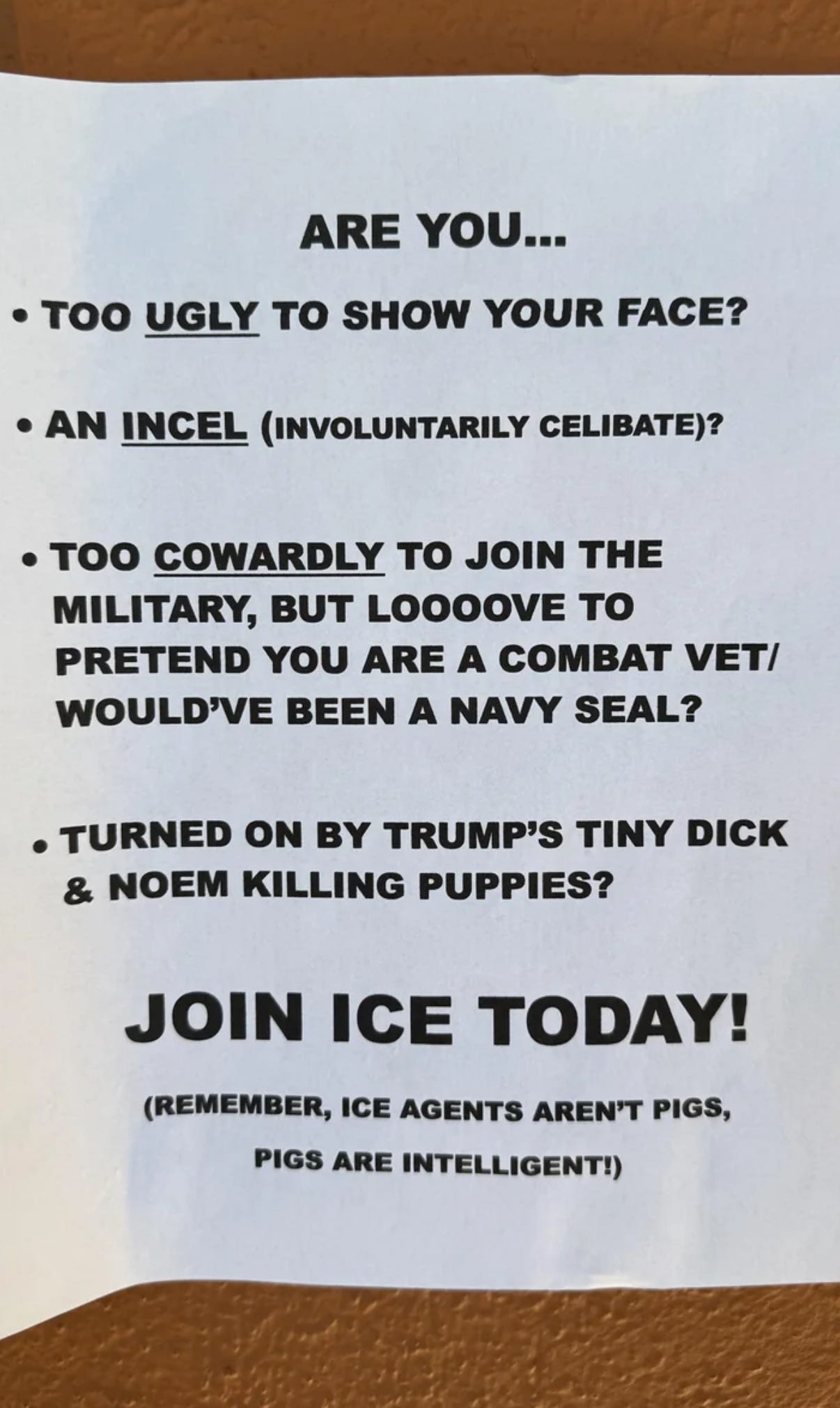 Oh well. If these MAGA farmers do go bankrupt, they can always join ICE. Their ads and commercials are being plastered everywhere now. This one was seen in San Diego: