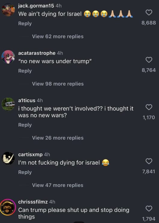 “We ain’t dying for Israel,” “No new wars under Trump,” and “Can Trump please shut up and stop doing things.”