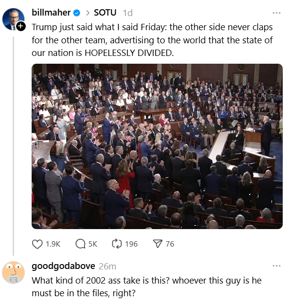 Then another random MAGA account that God has never heard of before named “Bill Maher” went viral by attacking Democrats for not standing or clapping for President Fascism. Which is deeply ironic, because Russian bot accounts like “Bill Maher” have been dividing the USA for years.