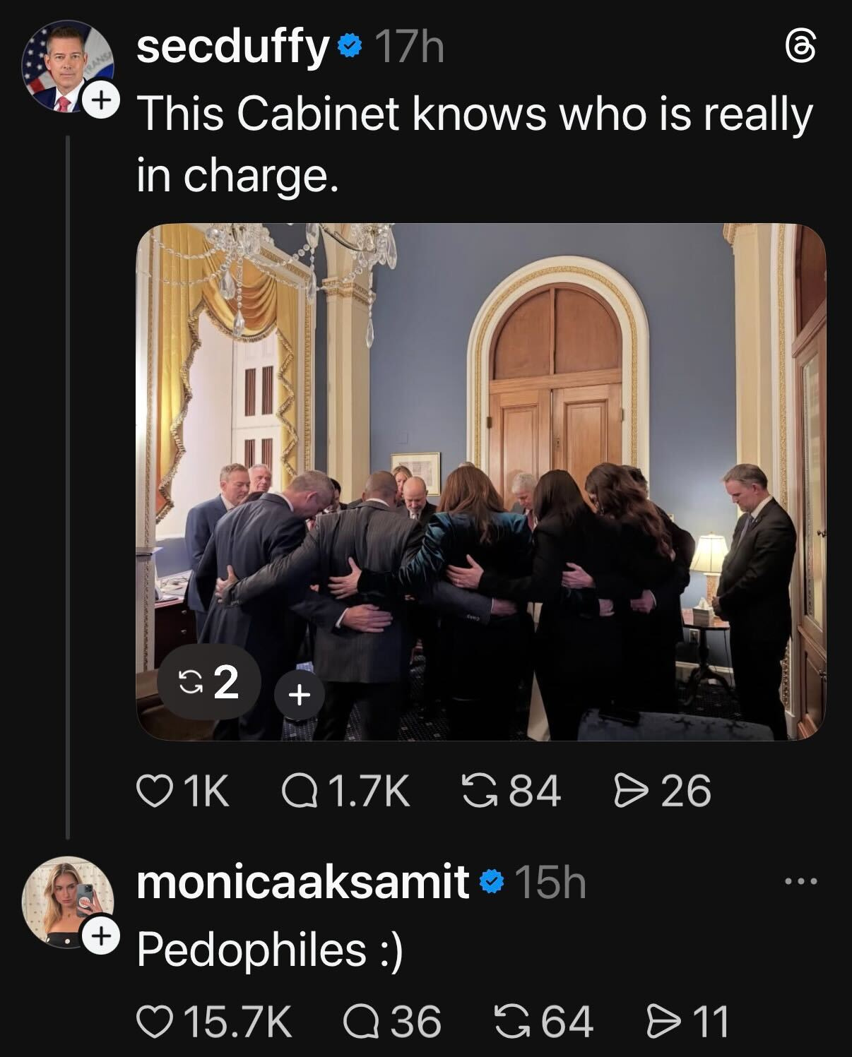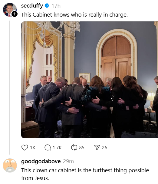 Secretary of Transportation Sean Duffy posted a photo of the entire cabinet huddled in a circle, locked in prayer. His caption simply said: “This Cabinet knows who is really in charge.”