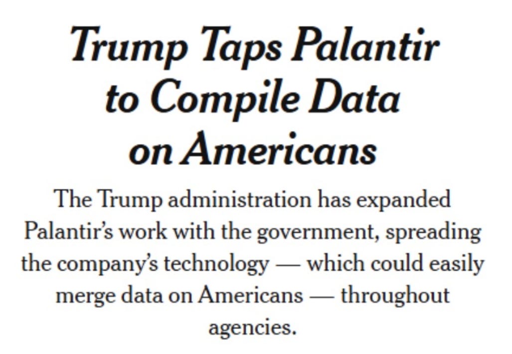 Trump just handed a massive contract to Palantir, Peter Thiel’s AI-powered spy firm. Their job is to build a centralized database on all Americans, combining facial recognition, license plate tracking, ICE targeting, biometric data, and whatever else they damn well want.