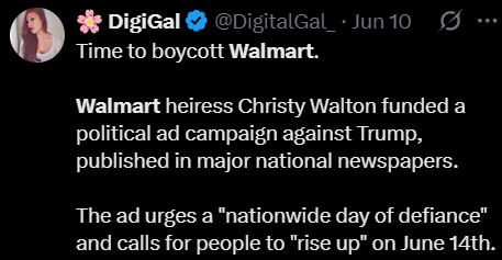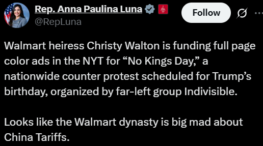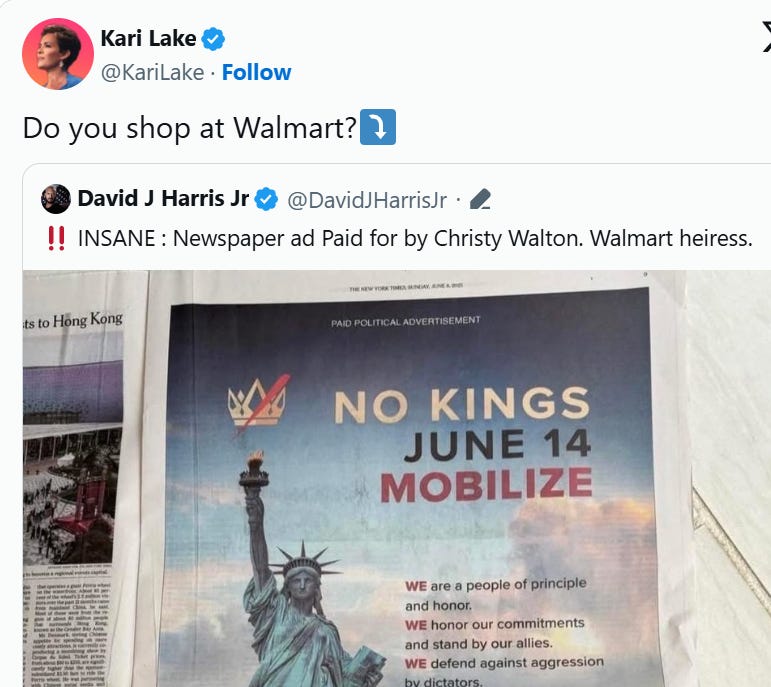 Lo, witness fools boycott their own kingdom. A Walmart heiress paid for a “No Kings” full-page ad in the New York Times and MAGA instantly vowed to never shop at Walmart again. Ya know, where they buy all their stuff.