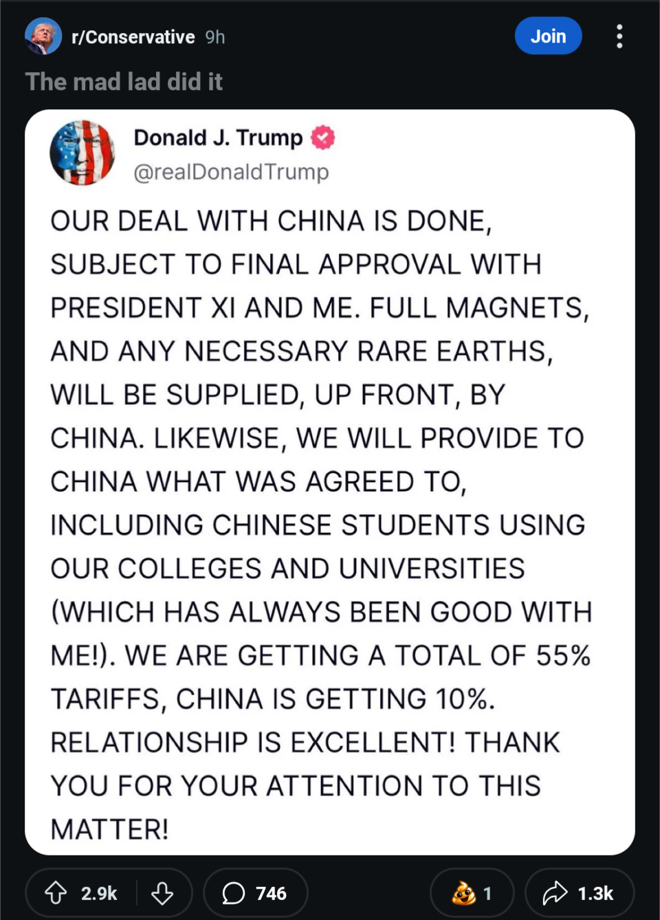 Yes, about those China tariffs, Trump announced he had “won” a new deal with China this week, by announcing that American consumers pay 55% tariffs and China pays only 10%.
