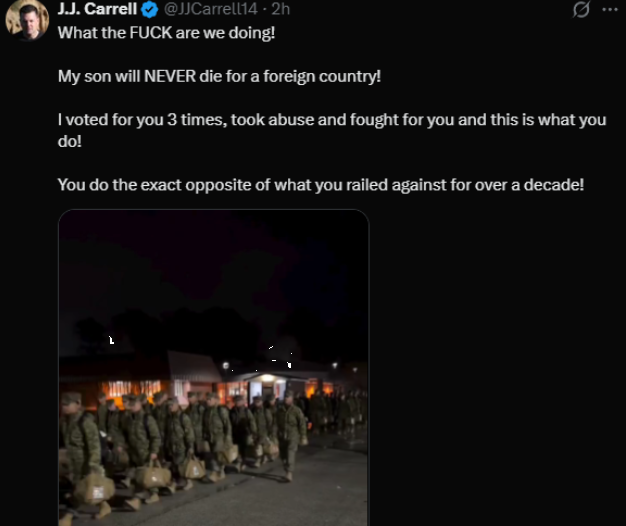 One loyal Trump supporter posted, “What the FUCK are we doing!” then added: “My son will NEVER die for a foreign country! I voted for you 3 times.”