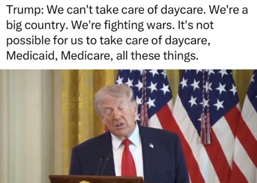 Trump is telling working families there is no money for childcare, healthcare, or food because there is always another war to fund.