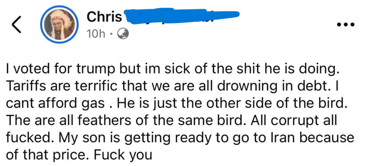 Lo, after President Epstein’s batshit crazy message to the nation last night on Iran, God thought it would be fun just to check in on how MAGA is doing these days.