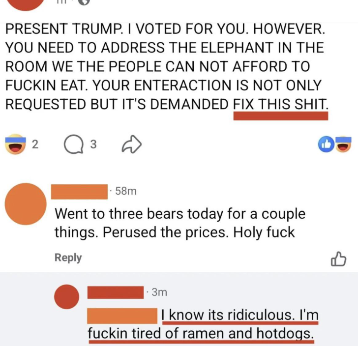 Check out this regretful Trump voter, who shouts in all caps, “WE THE PEOPLE CAN NOT AFFORD TO FUCKIN EAT.”