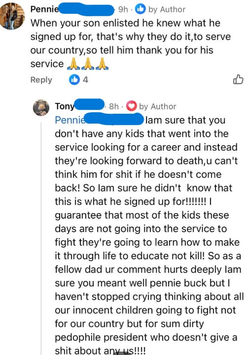 Another father fired back at the usual braindead “he knew what he signed up for” line by saying these kids went into the service for a career, an education, and a future, not to die for “some dirty pedophile president who doesn’t give a shit about any of us.” Well said.