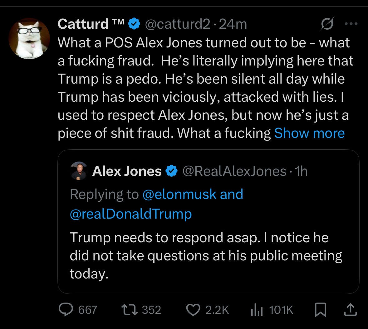 Whatever the fuck Catturd is says "NOW" Alex Jones is a fraud. Not back when the miserable piece of shit was spewing lies about murdered children or selling whatever bullshit supplements he had? Fuck all of them.