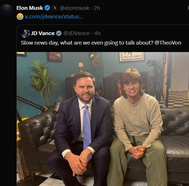 After a long day of telling the world that Donald’s a huge pedophile, Elon boosted a podcast appearance from JD Vance.