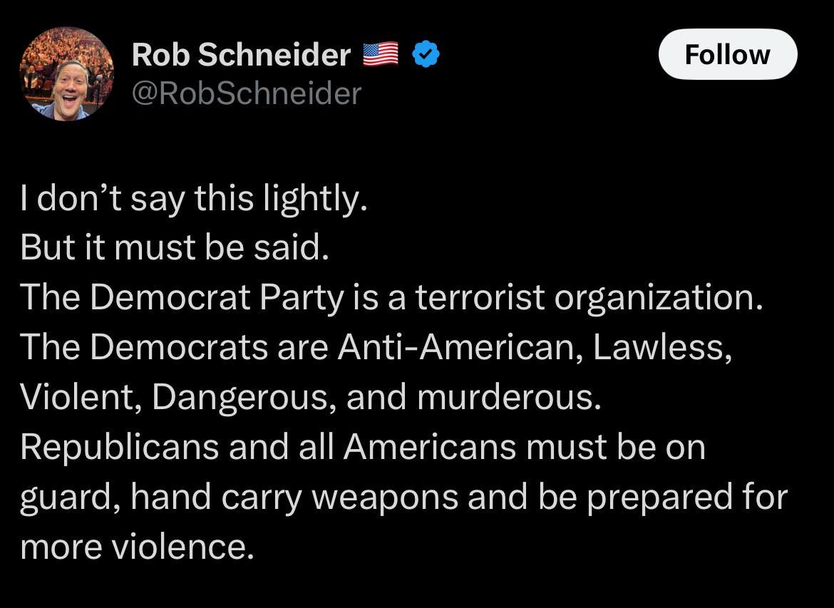 Elon Musk blamed “the violent left” and Rob Schneider called Democrats “a terrorist organization.”