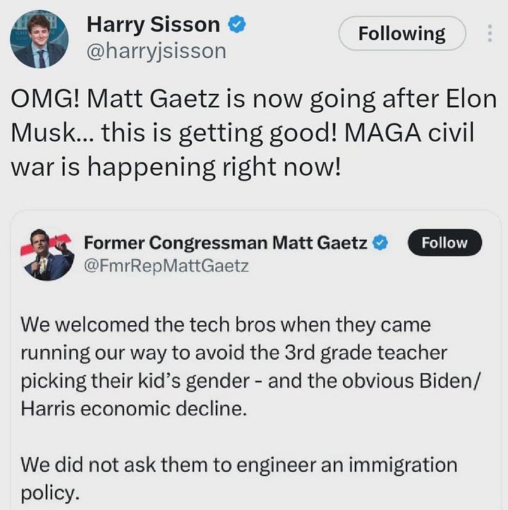 Possibly as a sign that Trump is beginning to push back against Elon, some of his top allies went on the attack. Failed Attorney General nominee and rapist Matt Gaetz accused Musk of pandering to “tech bros” and failing to uphold MAGA’s anti-immigration gospel.