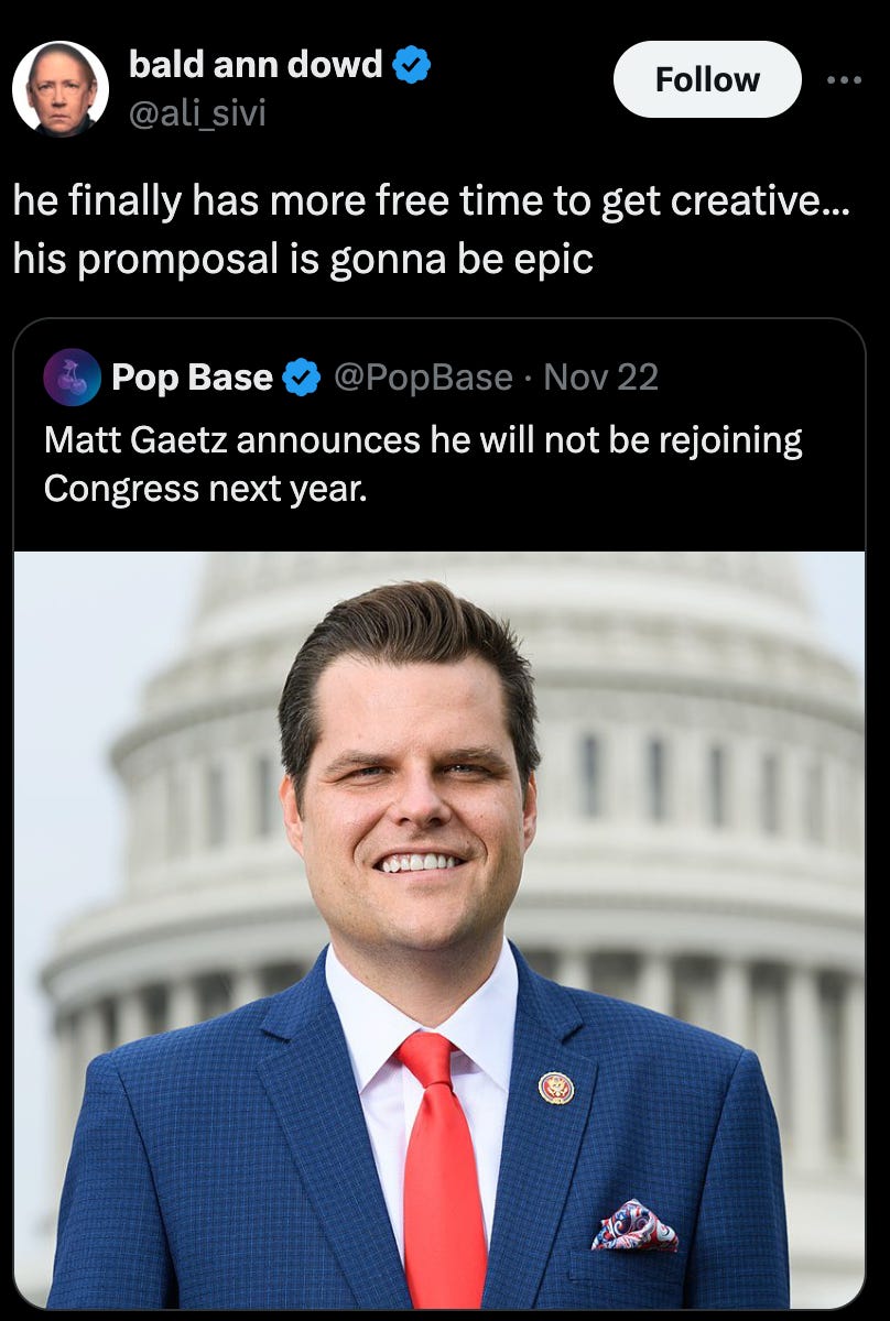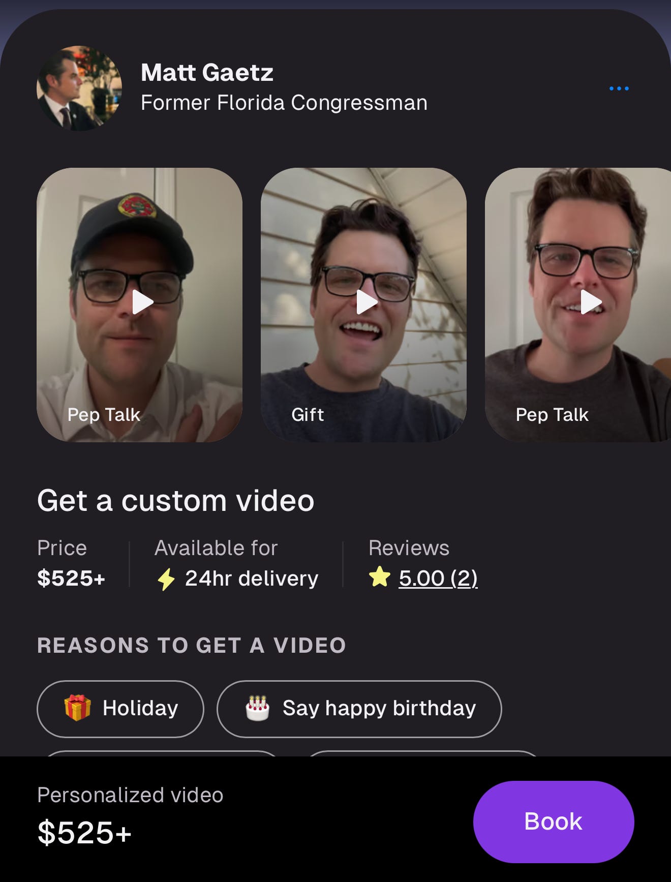 Since he had already resigned from Congress to take on the AG gig, he’s now totally out of a job. Following in the footsteps of former disgraced Congressman George Santos, Gaetz is now on Cameo.