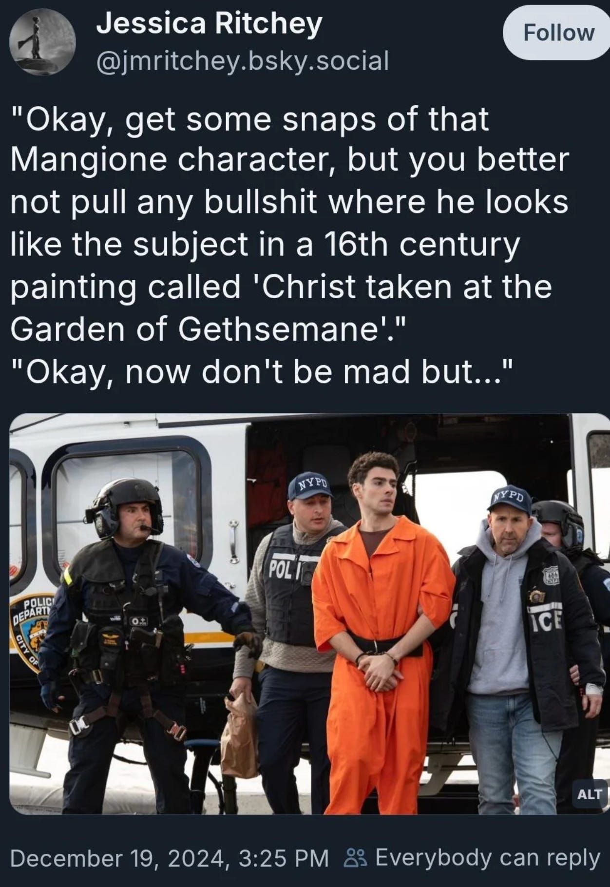 I have to also point out that the cops are inviting comparisons between Luigi and I when they treating him like Bane during a high-profile perp walk in New York. It’s even evoking comparisons to some of my best paintings: