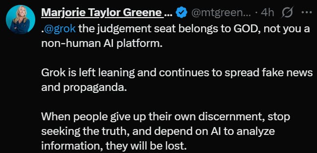 MTG warned Grok that “the judgment seat belongs to GOD,” not a “non-human AI platform.” Good point, Marj.