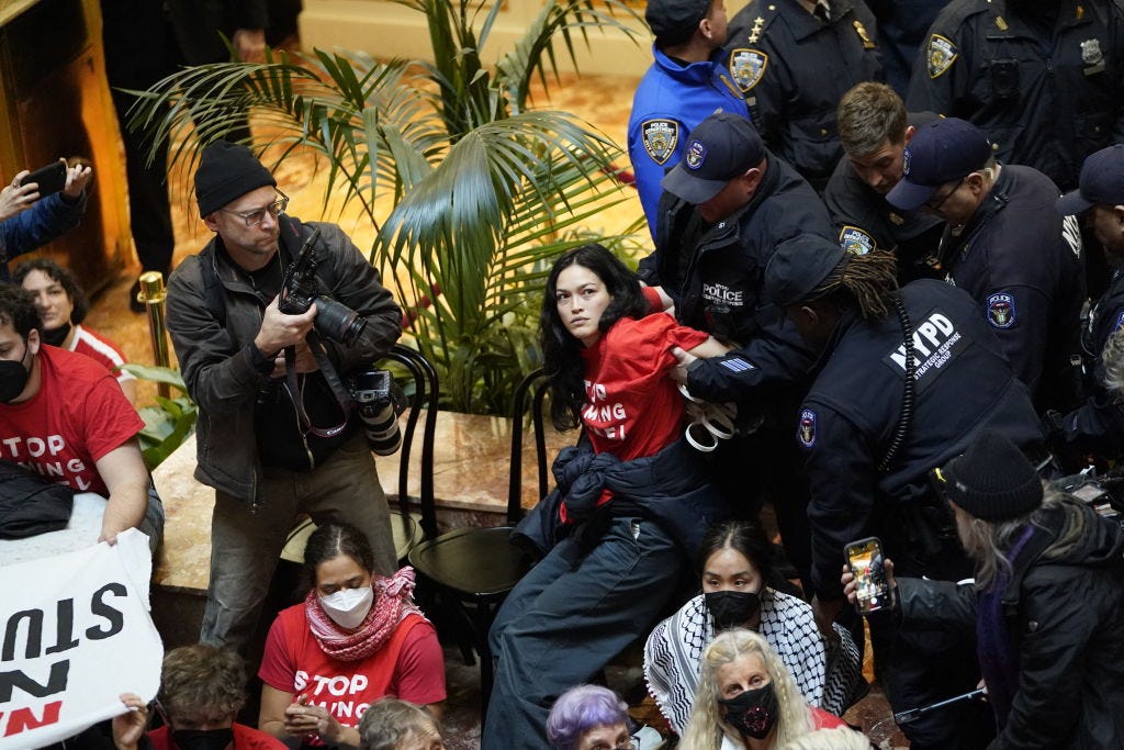 150 Jewish activists, mostly from Jewish Voice for Peace, stormed the public atrium of Trump Tower. 98 were arrested on charges of trespassing, obstruction, and resisting arrest.