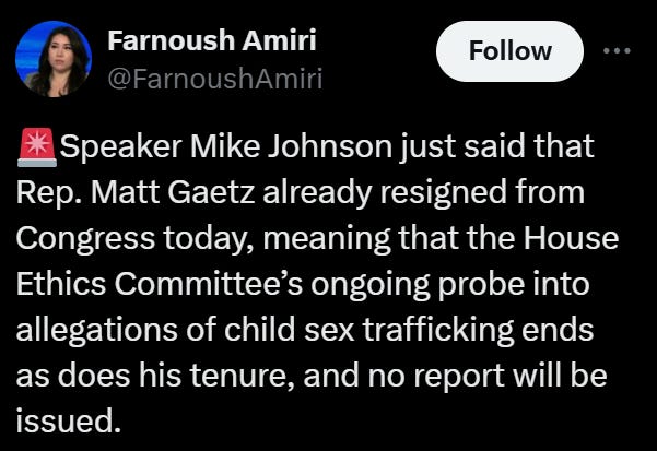 Qanon makes pedophile top cop! Matt Gaetz barely legal to lead all legality! This is a new low, humans. America is a turd circling the drain.