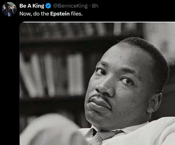 MLK’s daughter Bernice instantly smote Donald for using her father this way, saying “Now, do the Epstein files.”