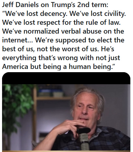 Jeff Daniels has spoken the truth. He said Trump represents everything wrong with not just America, but with being a human being. He called out the loss of decency, civility, and respect for the rule of law. And he said what needed to be said: “we’re supposed to elect the best of us, not the worst.”
