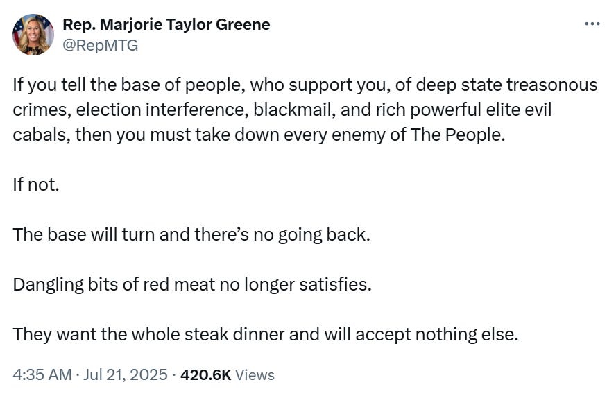 Even she knows that MAGA is in open revolt over the massive government Trump Epstein coverup.