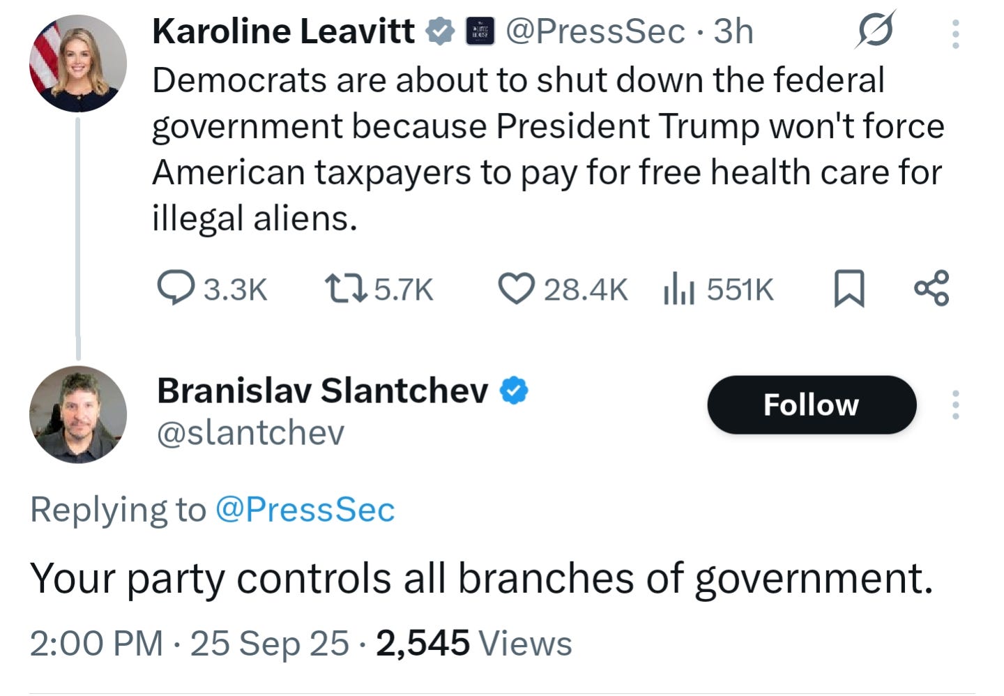 Behold the theater of fools. JD Vance is already tweeting that Democrats are about to shut down the government. The same government Republicans fully control. Every branch, every lever, every knob.