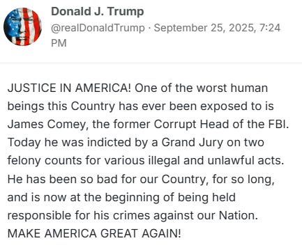 Next came the bogus indictment of James Comey. A stunt so transparent it practically sweats flop sweat. Trump demanded prosecution via leaked Pam Bondi dm last weekend and like clockwork his cronies delivered.