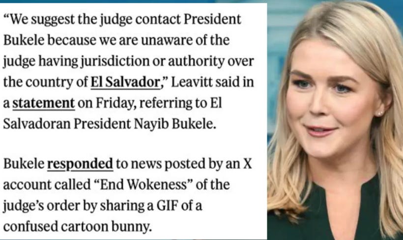 When the court demanded Kilmar’s return, Trump’s press secretary mocked the decision. Told the judge to ask President Bukele of El Salvador instead.