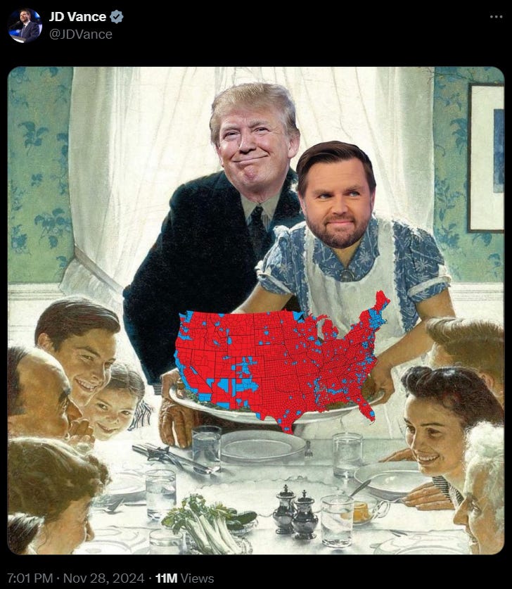 Vice-president-elect JD Vance posted an image of himself playing Trump’s wife, complete with a wildly misleading electoral map. This is beyond parody, so I offer you my reaction in gif form.