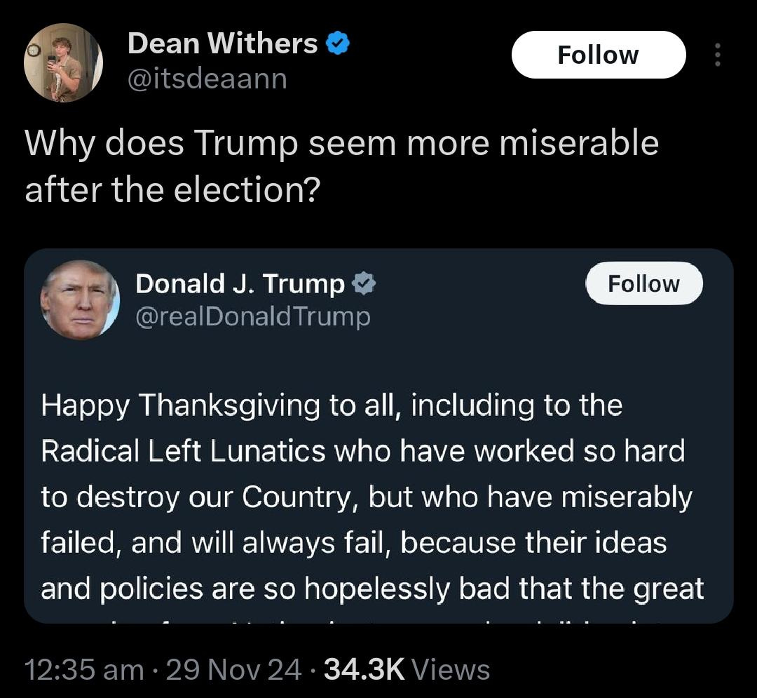 For his part, Donald marked Thanksgiving with his usual angry, divisive rant… as he always does on major holidays. Or on any random day. He won the election, yet he’s still miserable—and honestly, I quite enjoy that.