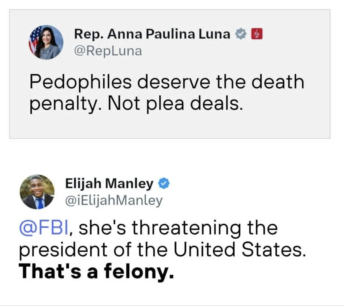 Anna Paulina Luna didn't mention Trump’s name in her post--she only said "Pedophiles." Is Elijah suggesting in his reply that Trump is a pedophile? Why yes, yes he is.