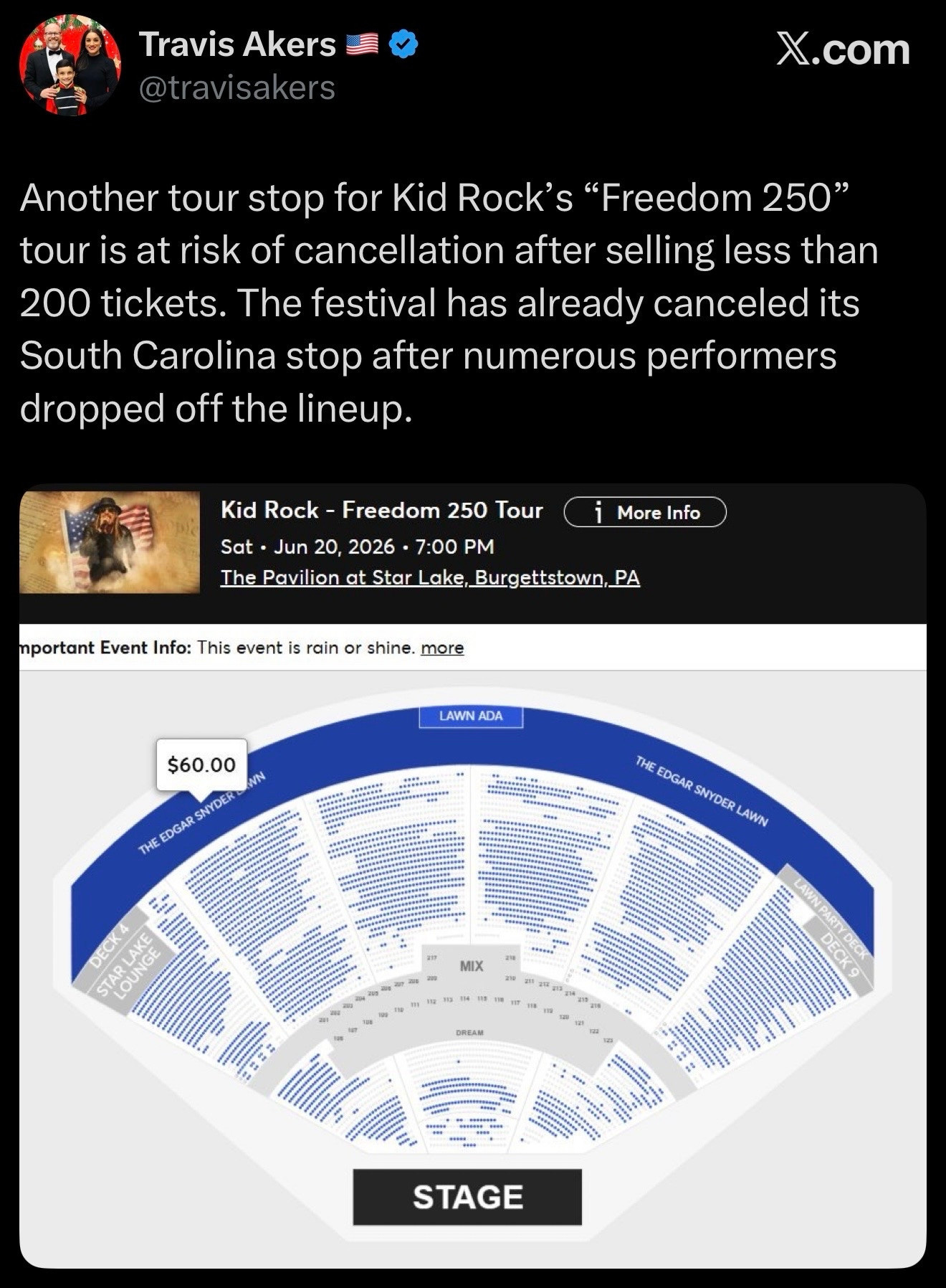 But if thou needest a little hit of justice today, just know that Kid Rock tickets are not selling well. He keeps having to cancel tour dates! HE CAN’T EVEN FILL A MASSIVE AUDITORIUM! HAHAHAHA!