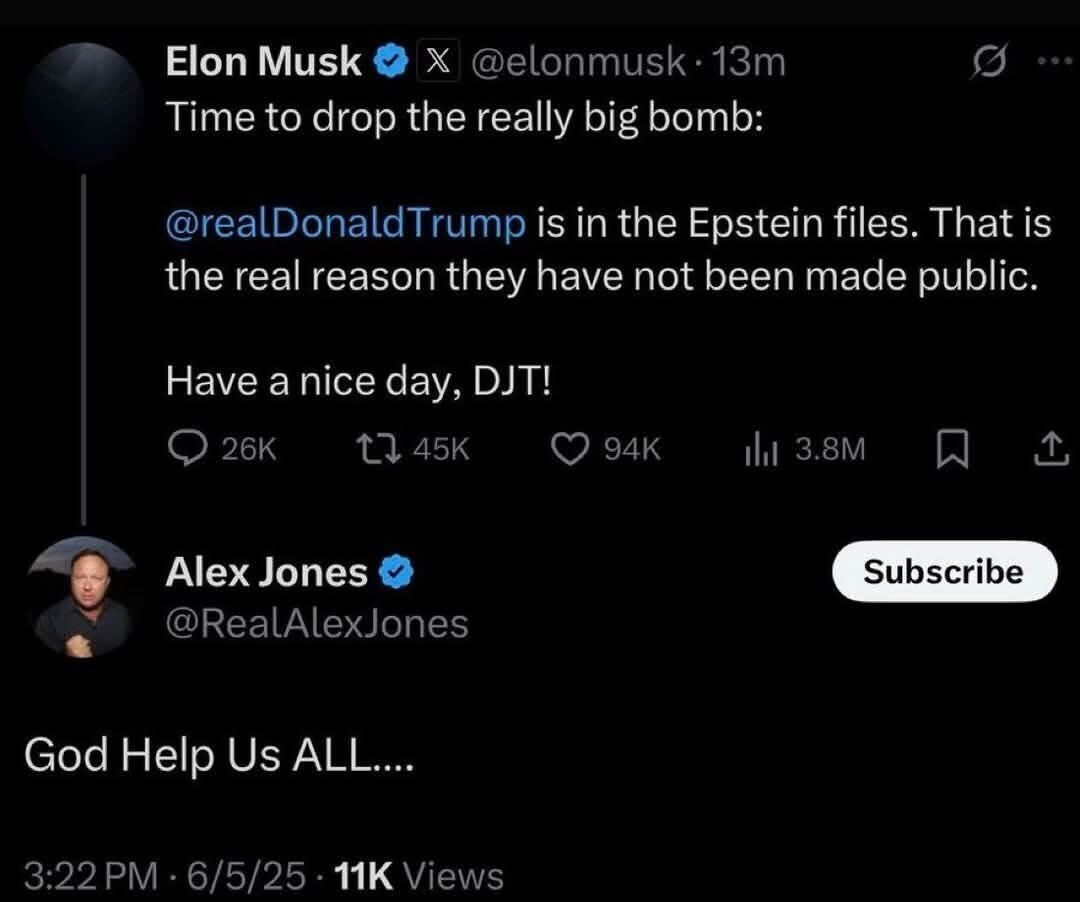 Then Elon, likely still hurting from the black eye Trump’s treasury douchebag Scott gave him last Friday, went for the jugular. That’s right, he told us what we’ve all known this entire time. Donald is a flagrant PEDOPHILE who hung out with Jeffrey Epstein.