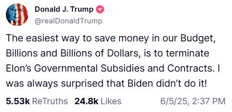 Donald, not wanting to respond to the pedophile allegations and thus give them more attention, instead threatened to terminate all of Elon’s government contracts.