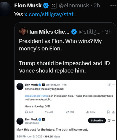 The wonderful thing about this Elon and Donald fight is that it’s escalating by the hour. Soon Elon will post that Donald wears a wig. By midnight Donald will threaten Elon with deportation.