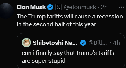 Elon responds by saying that “The Trump Tariffs will cause a recession in the second half of this year.” That’s right, he called them ‘Trump Tariffs.’