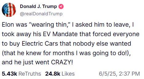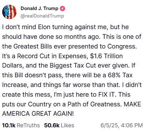 Trump, clearly getting his ass handed to him, tried to calm things down by lying to Elon that his bill will cut costs.