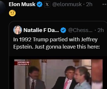 Finally, Elon followed up by reposting the famous video of Donald Trump partying with Jeffrey Epstein and young girls.