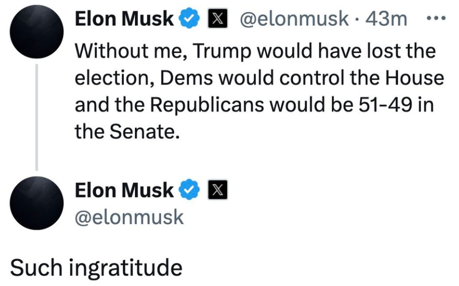 The day started out with Elon blithely admitting to the world that he rigged the election for Donald Trump. That’s what I see here.