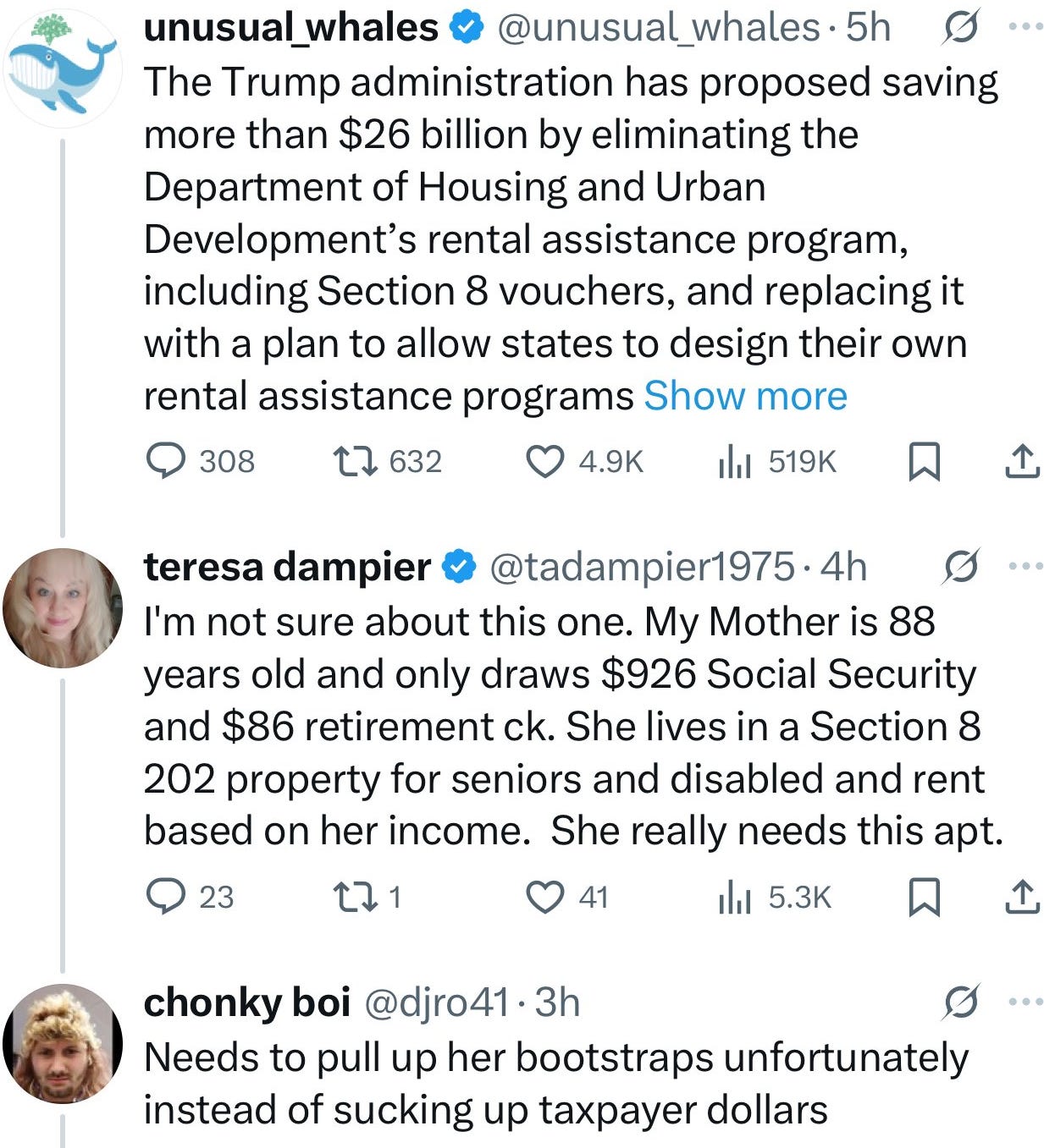 As noted by ‘Unusual Whales’ on Bluesky, Trump’s budget cuts over twenty-six billion from housing aid. That includes the Section 8 lifeline keeping thousands of elderly mothers off the street.