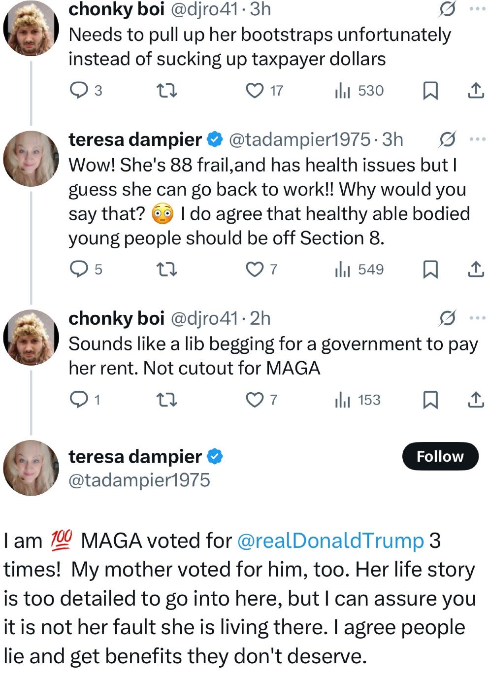 Well, a Trump voter named Teresa responded with a tale of woe. Her mom is 88 years old and, like many people, rightfully needs this program to keep an apartment.