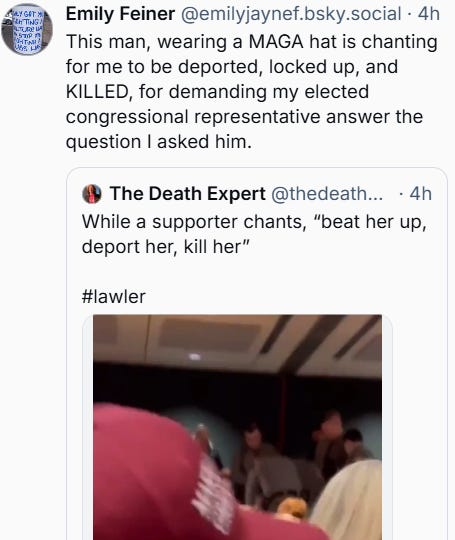 This is America in 2025: a peaceful woman asks a question at a town hall, and a MAGA cultist chants for her to be beaten, deported, and killed.