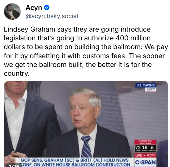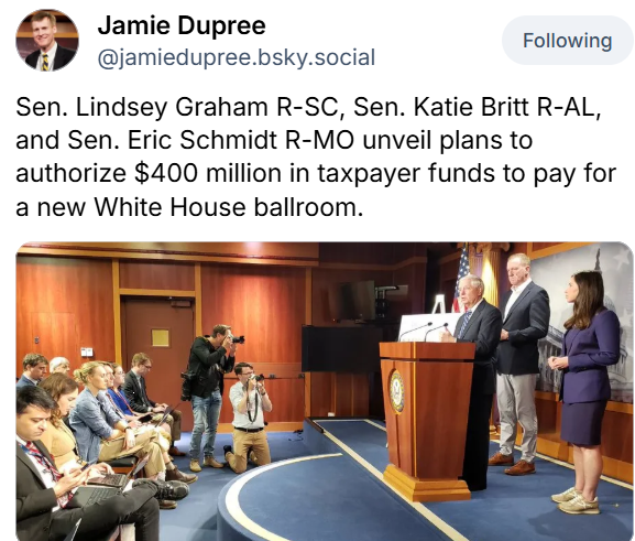 Lo, the Republicans are now out in force seriously trying to get you to pay for Donald’s vanity golden Epstein ballroom.
