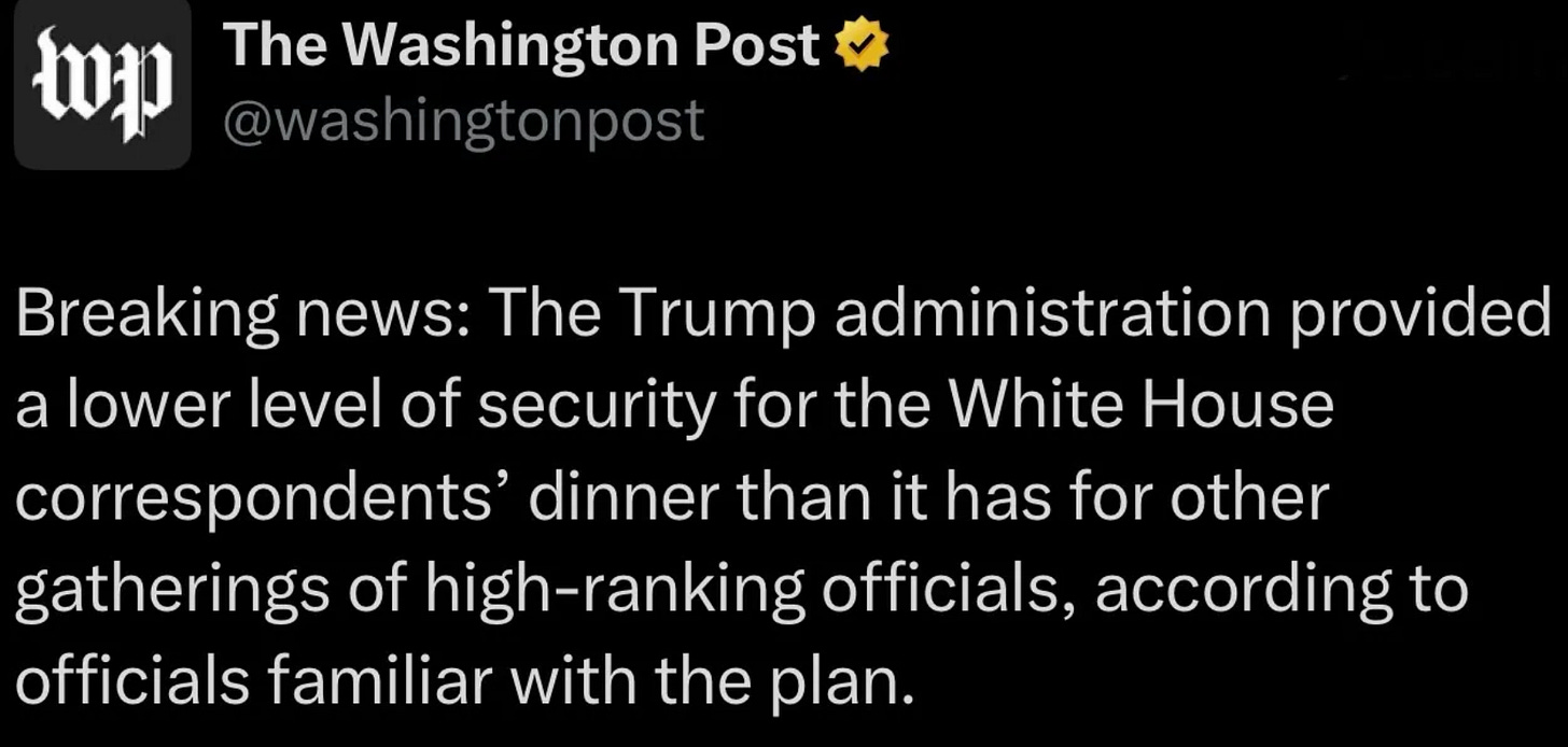 The Washington Post confirm that security was — for some reason — extremely lax for the White House Press Correspondents Dinner.