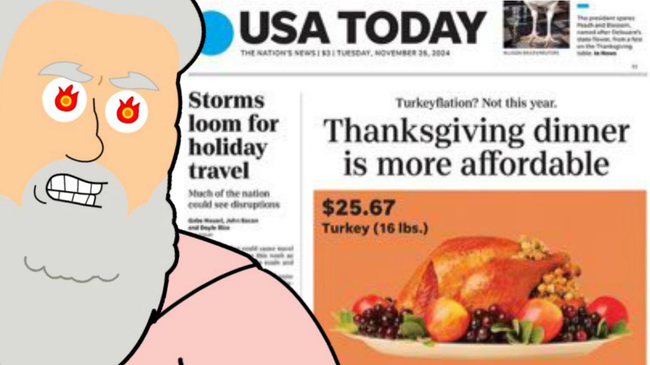 By the way, did you see this issue of USA Today? Now that the election is over, they’ve decided to focus on how the price of food has gone down. They want the average American idiot to pick up the paper, smack it with one hand and smile as they say, “See? Trump is already bringing prices down.”