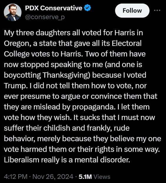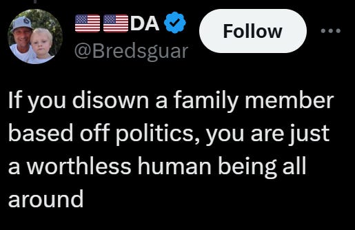 One way they’re choosing to fight back is by refusing to break bread with the people who chose this insanity. In many cases, these people are their own family. Like this Trump voter, who posted on X: