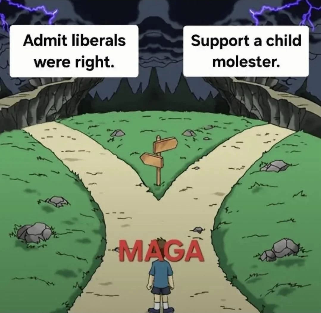You’ve seen the photos and videos. You’ve heard the stories from witnesses. Trump and Epstein were best friends. For fifteen years, they flew together, dined together, competed over women at parties like it was a disgusting sport. Epstein was the only other man present at a Mar-a-Lago party where 28 women were flown in by Donald. And on and on and on. The evidence is never ending.