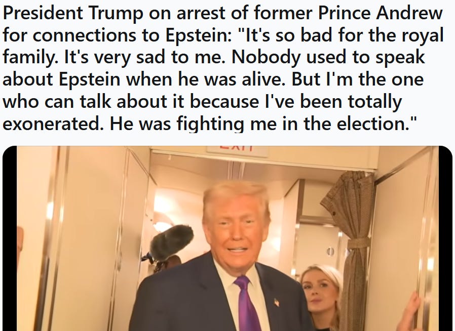 President Trump on arrest of former Prince Andrew for connections to Epstein: "It's so bad for the royal family. It's very sad to me. Nobody used to speak about Epstein when he was alive. But I'm the one who can talk about it because I've been totally exonerated. He was fighting me in the election."