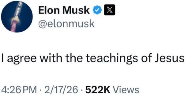 But in the good news department, at least Elon Musk is losing his mind from being outed so extensively in the Epstein files. He’s trying to do a full Jesus turn now, you know, just like Russell Brand. So clearly something horrible is about to come out about him at any minute.
